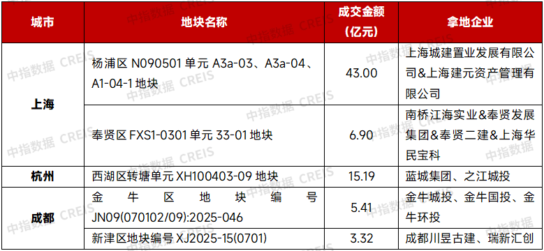 值得注意的是,11月民营房企拿地较为活跃,且主要集中在一二热点城市。一线城市中,北京朝阳区松榆里地块经超百轮竞价由懋源地产以50.24亿元竞得,这不是懋源地产今年首次拍地,8月,其以10.30亿元竞得顺义一地块。上海浦东新区PDP0-0706单元C05A-18地块、C05A-17地块经过82轮竞价由佳运置业以总价24.75亿元竞得。大华以11.42亿元竞得上海宝山区N12-0302单元U3-01地块。二线城市中,滨江继续在杭州拿地,金沙鹭岛在成都经过35轮竞价以3.37亿元竞得成都郫都区地块编号PD2025-19地块,溢价率39.53%。总的来看,民营房企依旧集中在自身优势区域拿地深耕。
