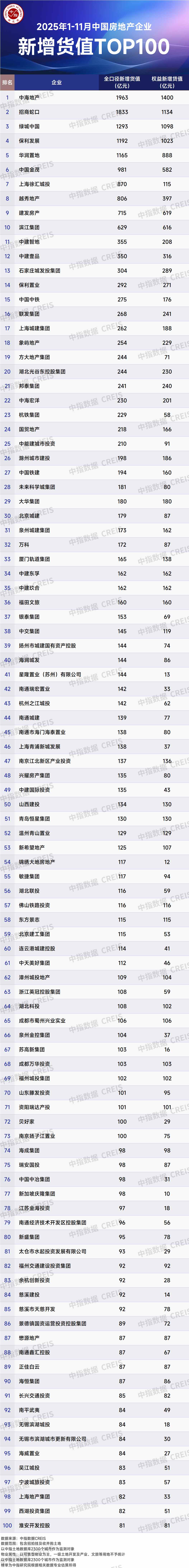 从新增货值来看,中海地产、招商蛇口(001979)和绿城中国位列前三。2025年1-11月,中海地产以1963亿元新增货值位列第一,招商蛇口(001979.SZ)新增货值规模为1833亿元,位列第二,两家企业均通过获取上海城市更新项目,货值大幅提升。绿城中国(03900)新增货值规模为1293亿元,位列第三。TOP10企业2025年1-11月新增货值总额11446亿元,占TOP100企业的47.1%,新增货值门槛跃升至81亿元。